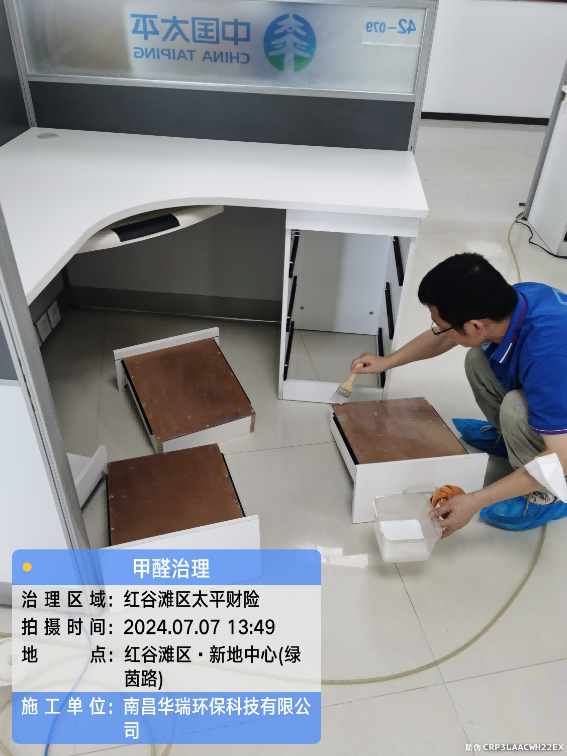 項(xiàng)目名稱:甲醛治理新地中心太平財(cái)險(xiǎn)施工日期:2024.7.7